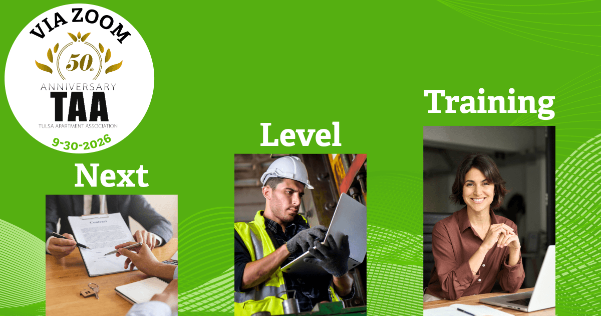 Next Level Training is an educational series designed to help apartment industry professionals sharpen their skills, expand their knowledge, and gain confidence in handling day-to-day responsibilities. These sessions provide accessible, practical learning opportunities not only for Tulsa-based members, but for professionals across Eastern Oklahoma.